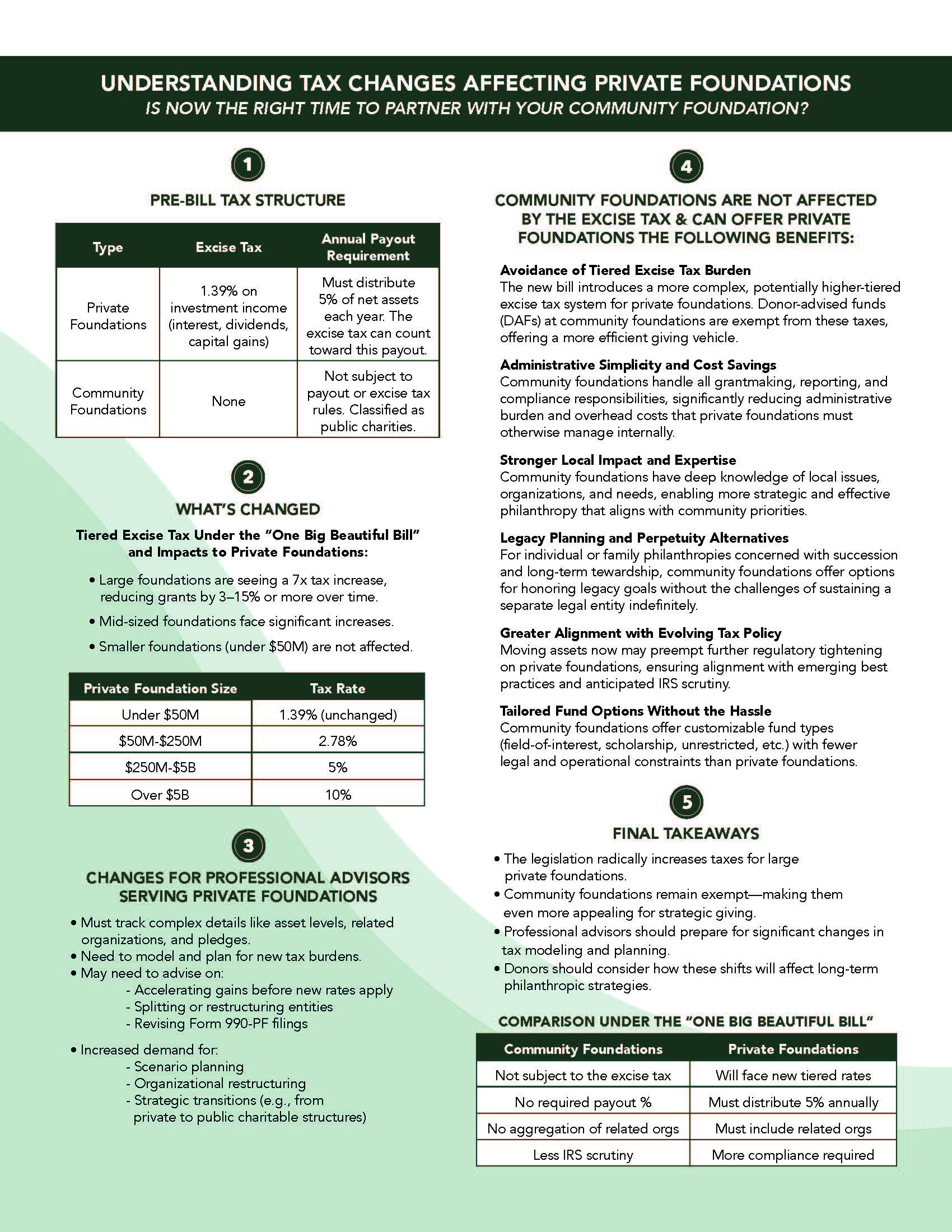 New federal legislation has introduced significant changes to the excise tax system for private foundations, creating higher, tiered tax rates that may impact grantmaking and compliance requirements. While large and mid-sized private foundations face increased financial and administrative burdens, community foundations remain exempt from these rules. This brochure outlines the new tax structure, what’s changed, and how community foundations can provide more flexible, cost-effective, and strategic giving alternatives for donors and advisors navigating this evolving landscape. See below for more information: